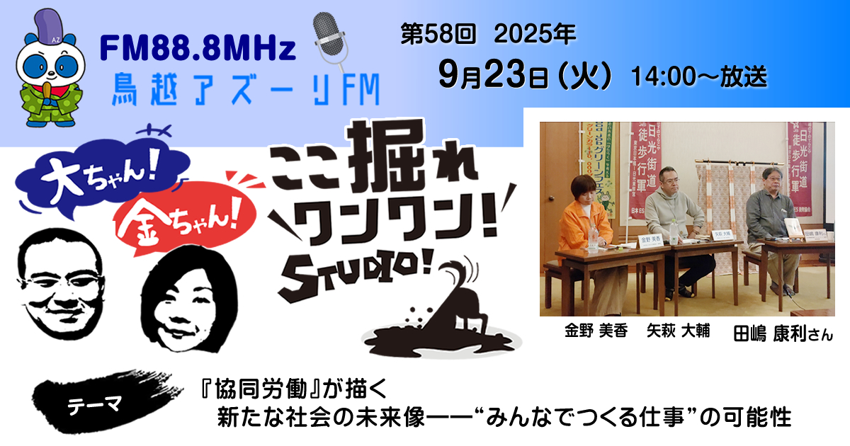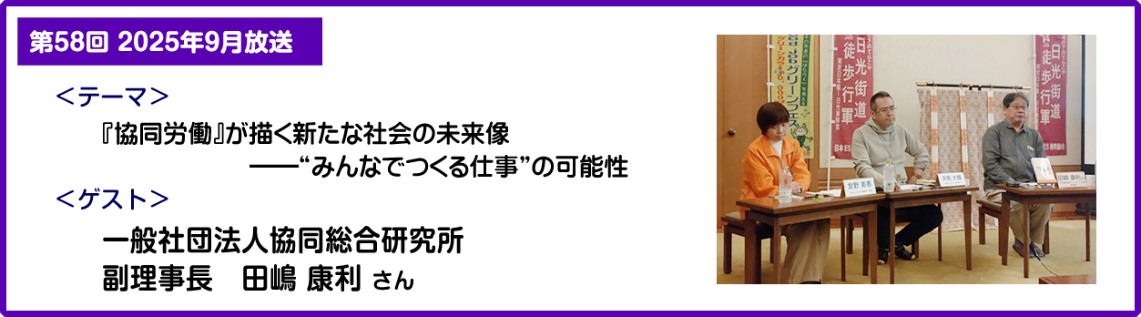 今回は、「『協同労働』が描く新たな社会の未来像――“みんなでつくる仕事”の可能性」をテーマに、一般社団法人協同総合研究所/副理事長の田嶋康利さんとの対談の様子をご覧いただきます。